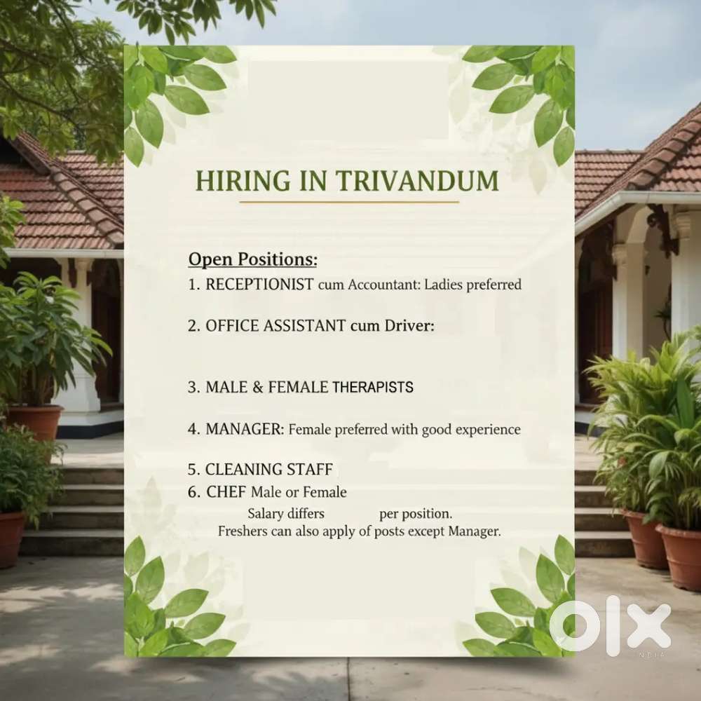 - Today₹ 10000 - 15000 | MonthlyHiring for a Leading Ayurveda Hospital in TrivandrumKowdiar, Thiruvananthapuram
