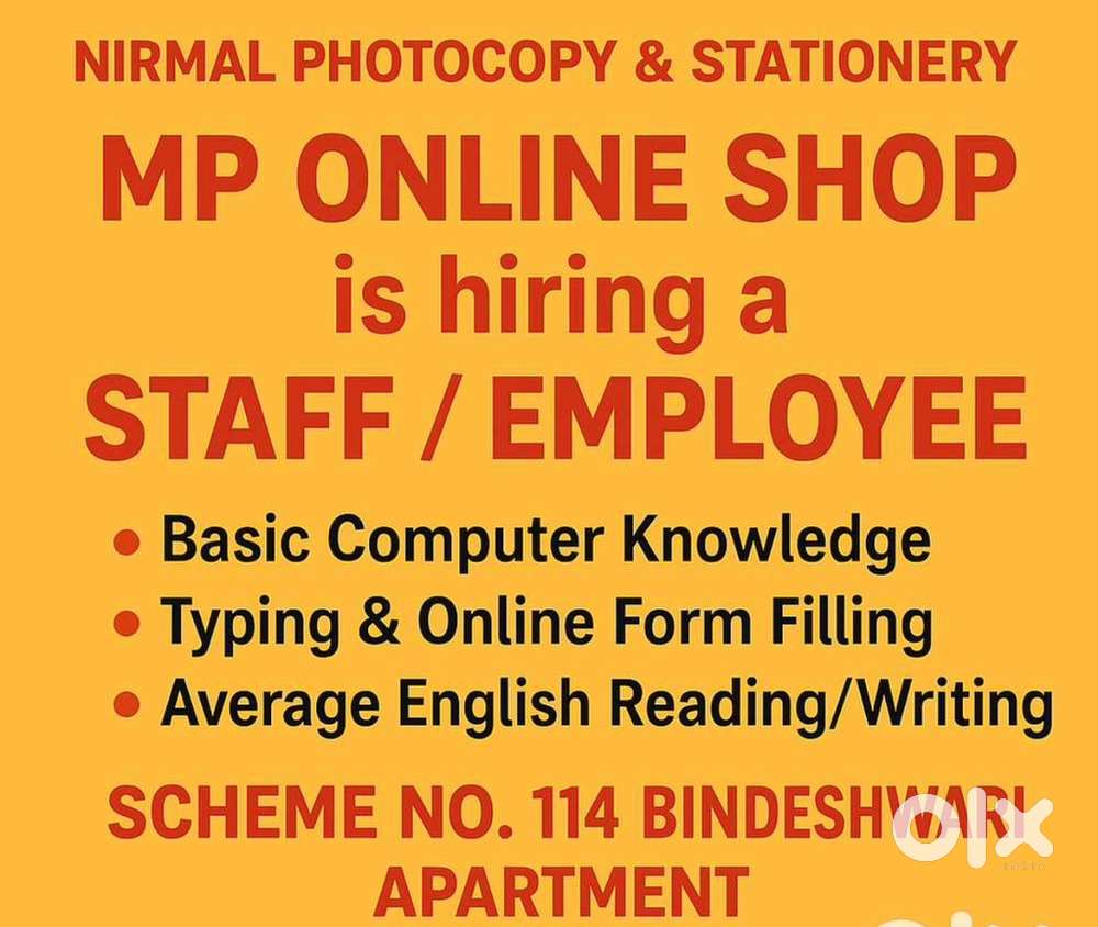 - ₹ 3000 - 6000 | MonthlyComputer Operator / Office Staff Required – MP Online Shop (Indore)Scheme No 73, IndoreToday