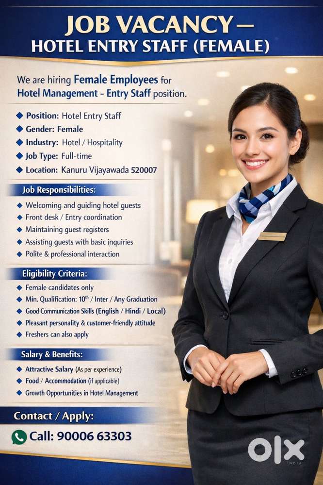 - ₹ 100000 - 150000 | MonthlyHOTEL RECEPTIONISTVasant Nagar, VijayawadaToday