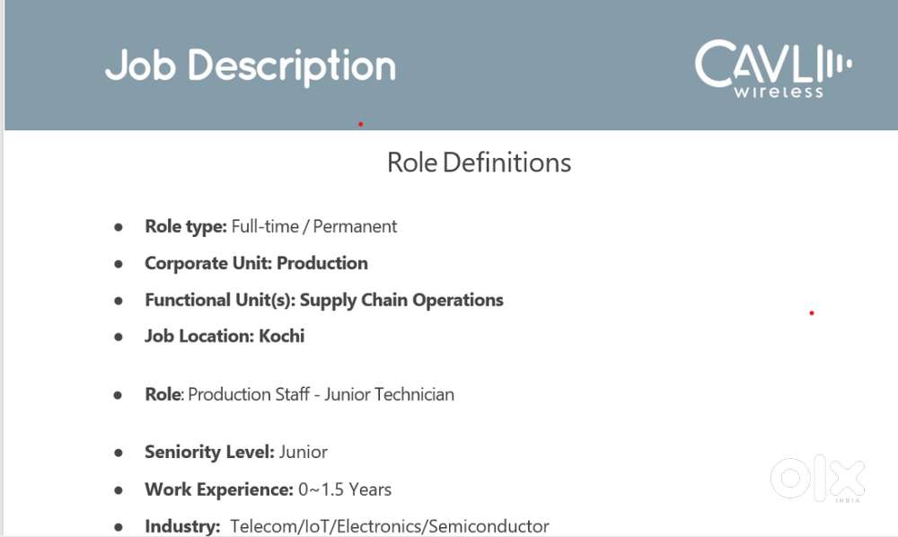 - ₹ 15500 - 15500 | MonthlyJunior TechnicianInfo Park Industrial Area, Kochi2 days ago