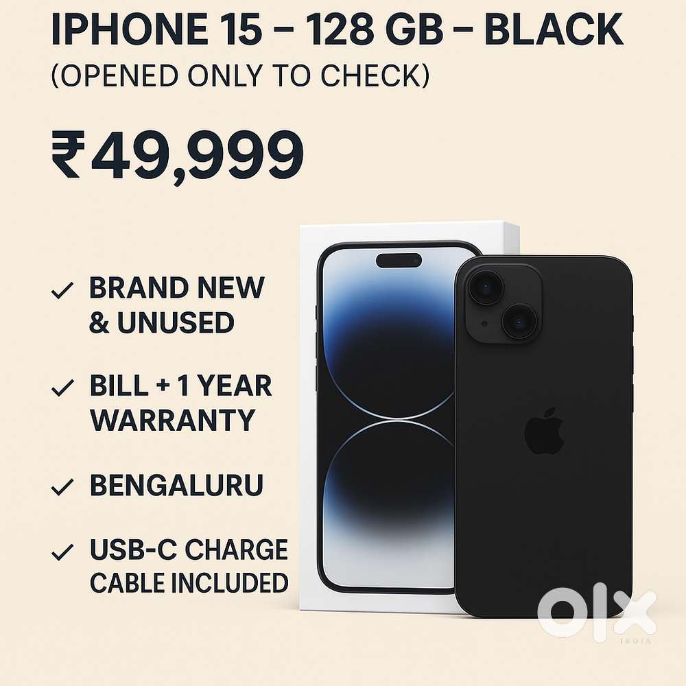 - ₹ 49,999Brand New iPhone 15 (128 GB, Black) – Bill Available – UnusedUlsoor, Bengaluru27 Nov
