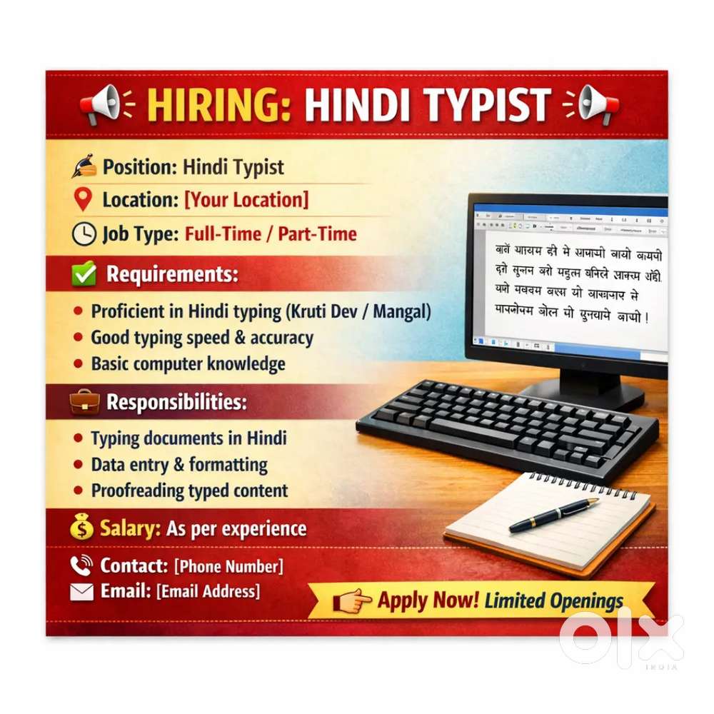 - ₹ 15000 - 22500 | MonthlyHindi Typist (Online)Aditya Nagar, KotaToday