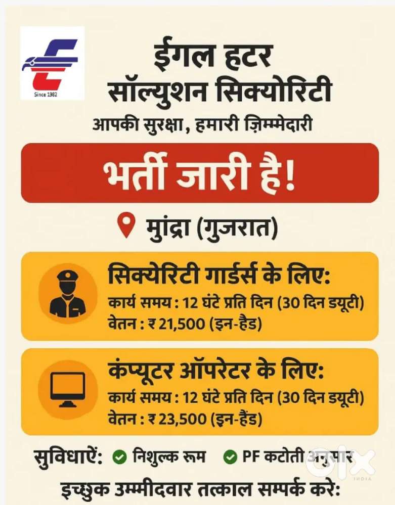 - ₹ 21500 - 25500 | MonthlyEagle hunter securityKhari Wadi, Mundra17 Nov