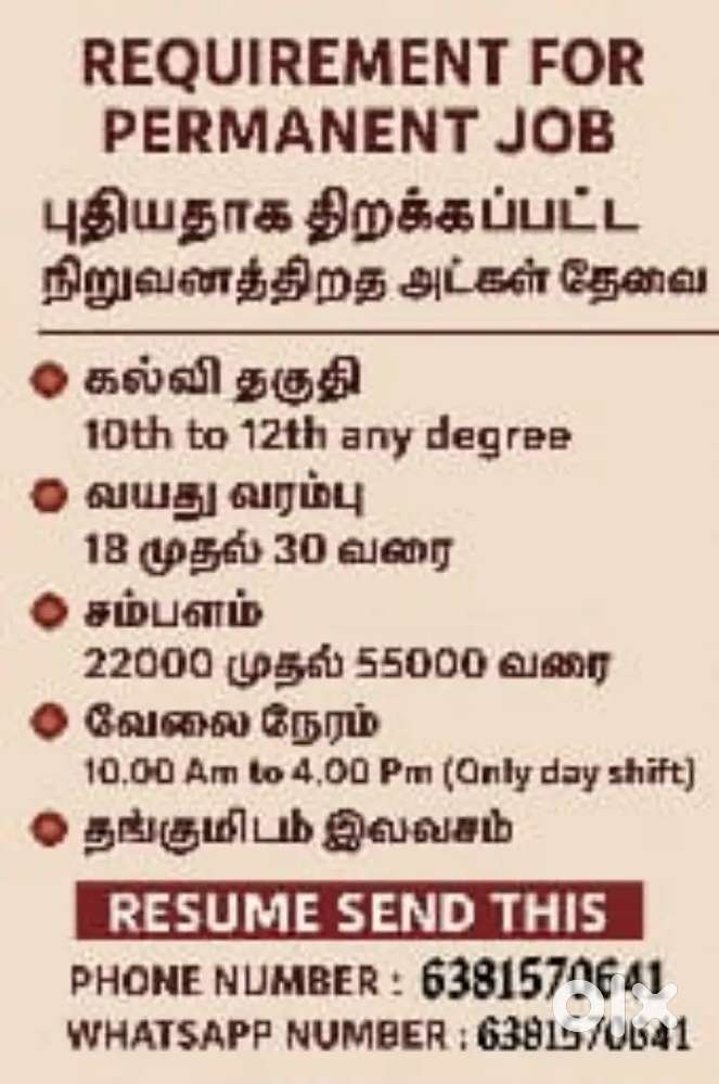 - ₹ 20000 - 25000 | Monthlyபுதியதாக திறக்கப்பட்ட . SK associates நிறுவனத்திற்கு ஆட்கள் தேவைChromepet Adam Nagar, Chennai21 Dec